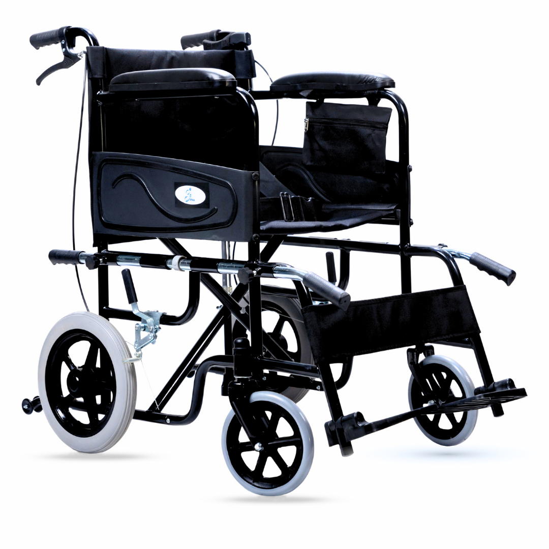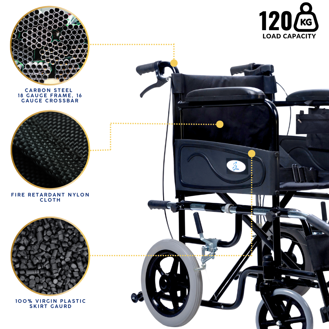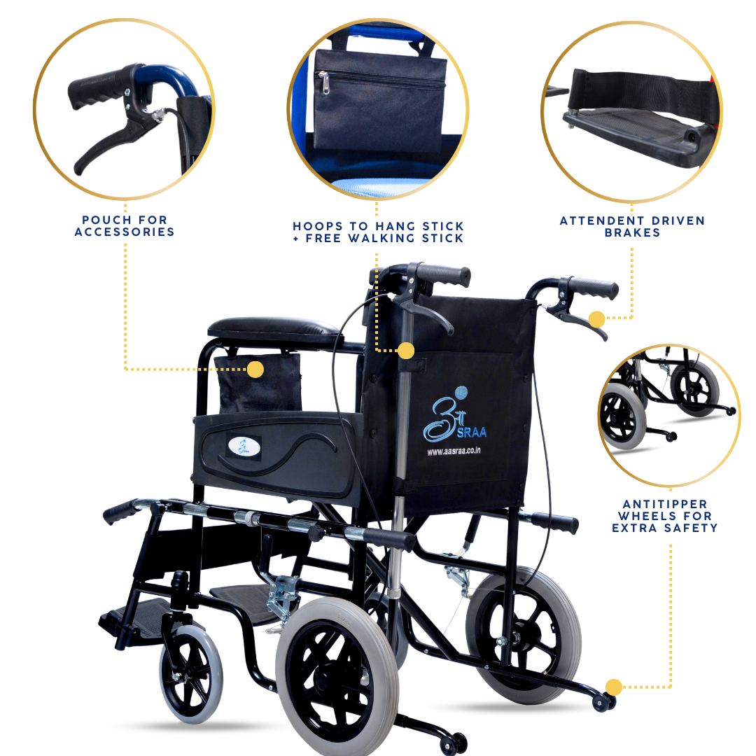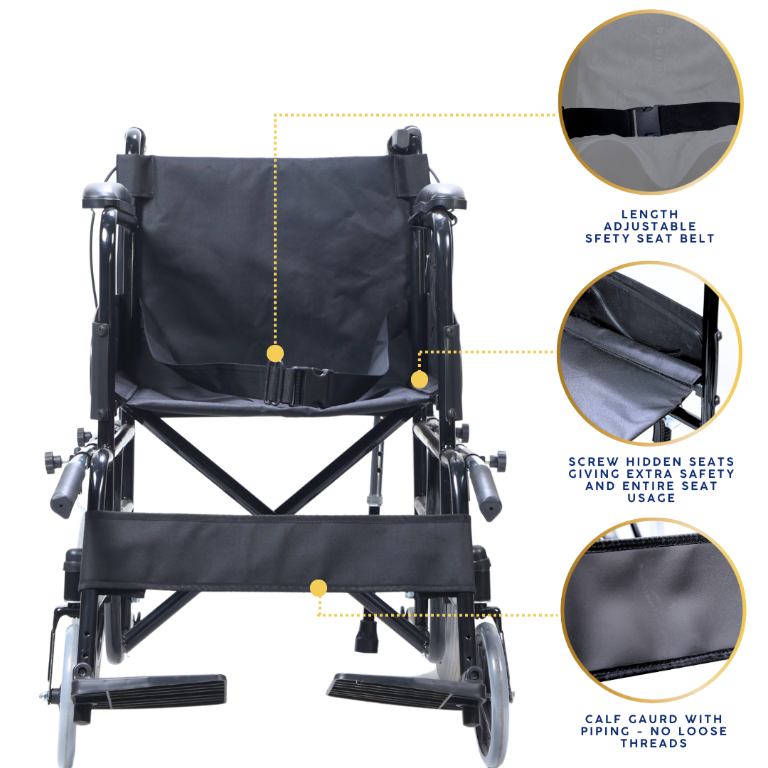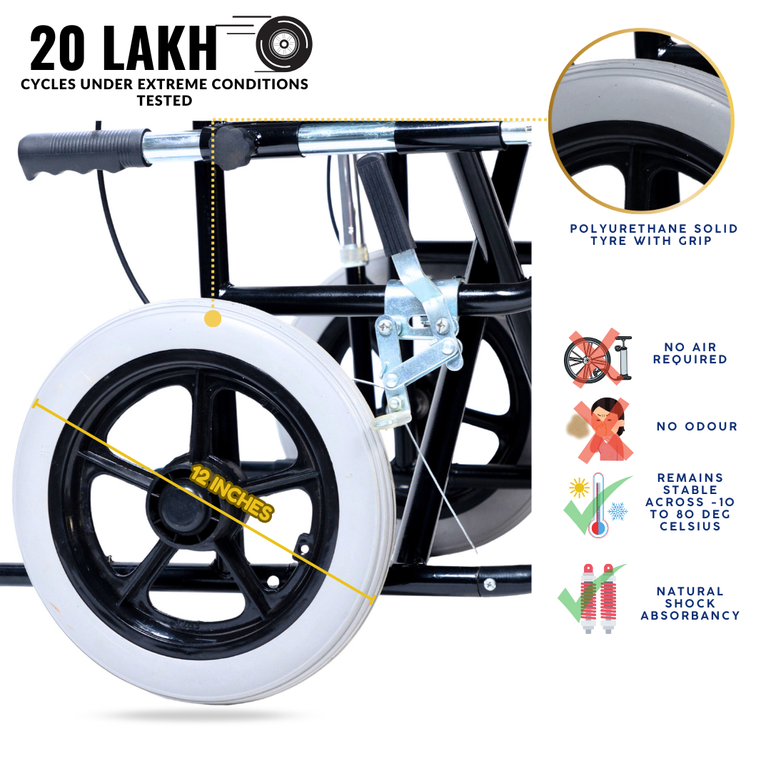 A feature-rich wheelchair designed for users with caretaker support. It combines safety and comfort with anti-tip wheels, seat-belt, attendant brakes, and additional nylon cushion with screw-hidden seats. Unique addons like lifting rods for stairs, loops with a free walking stick, storage pouch, and water-proof leatherite upholstery make it practical for daily use, while foldability and strong tyres ensure smooth mobility anywhere.