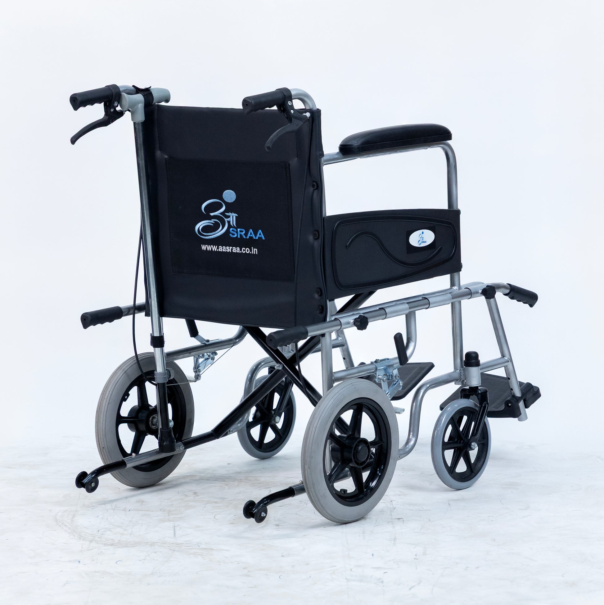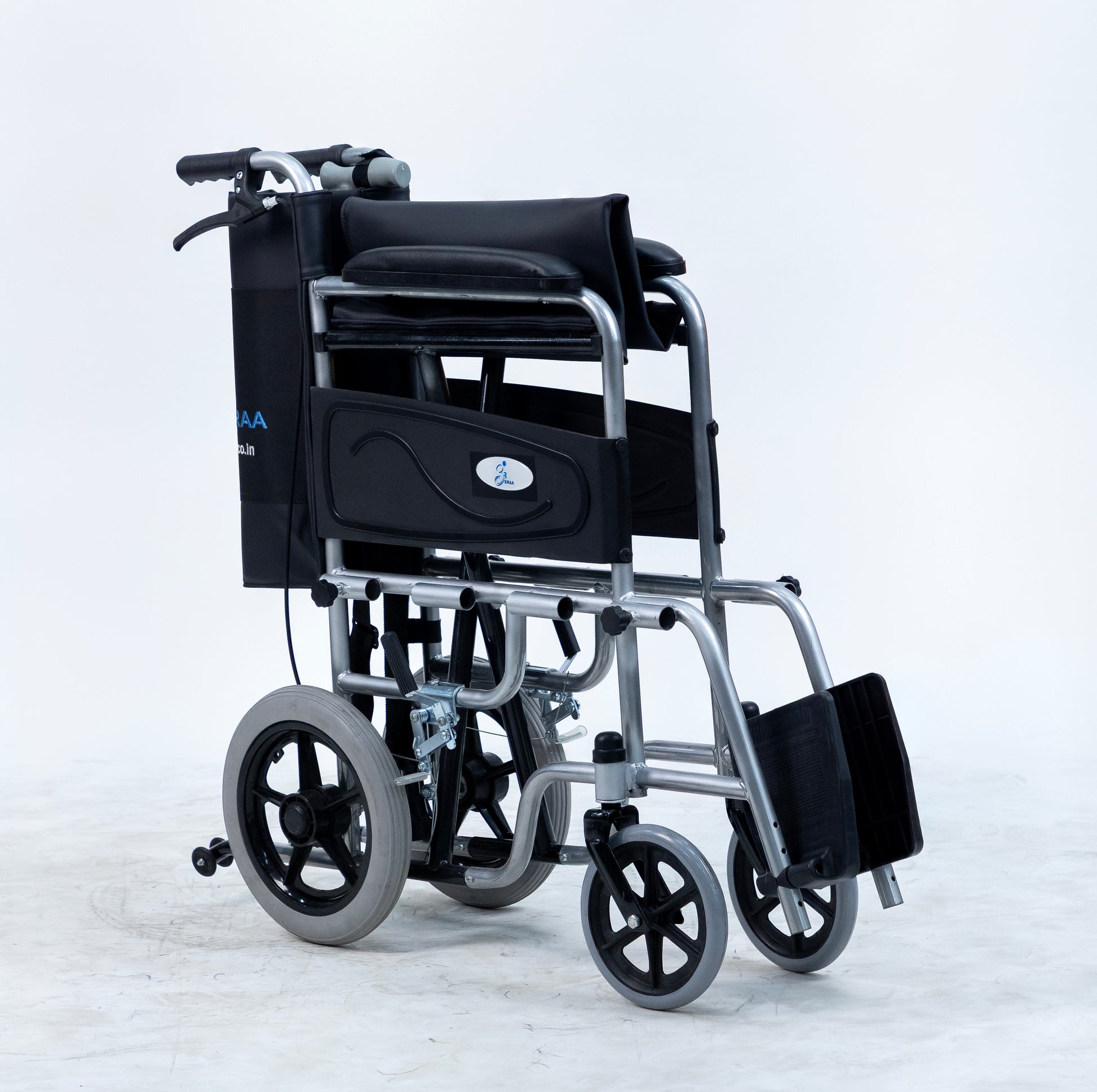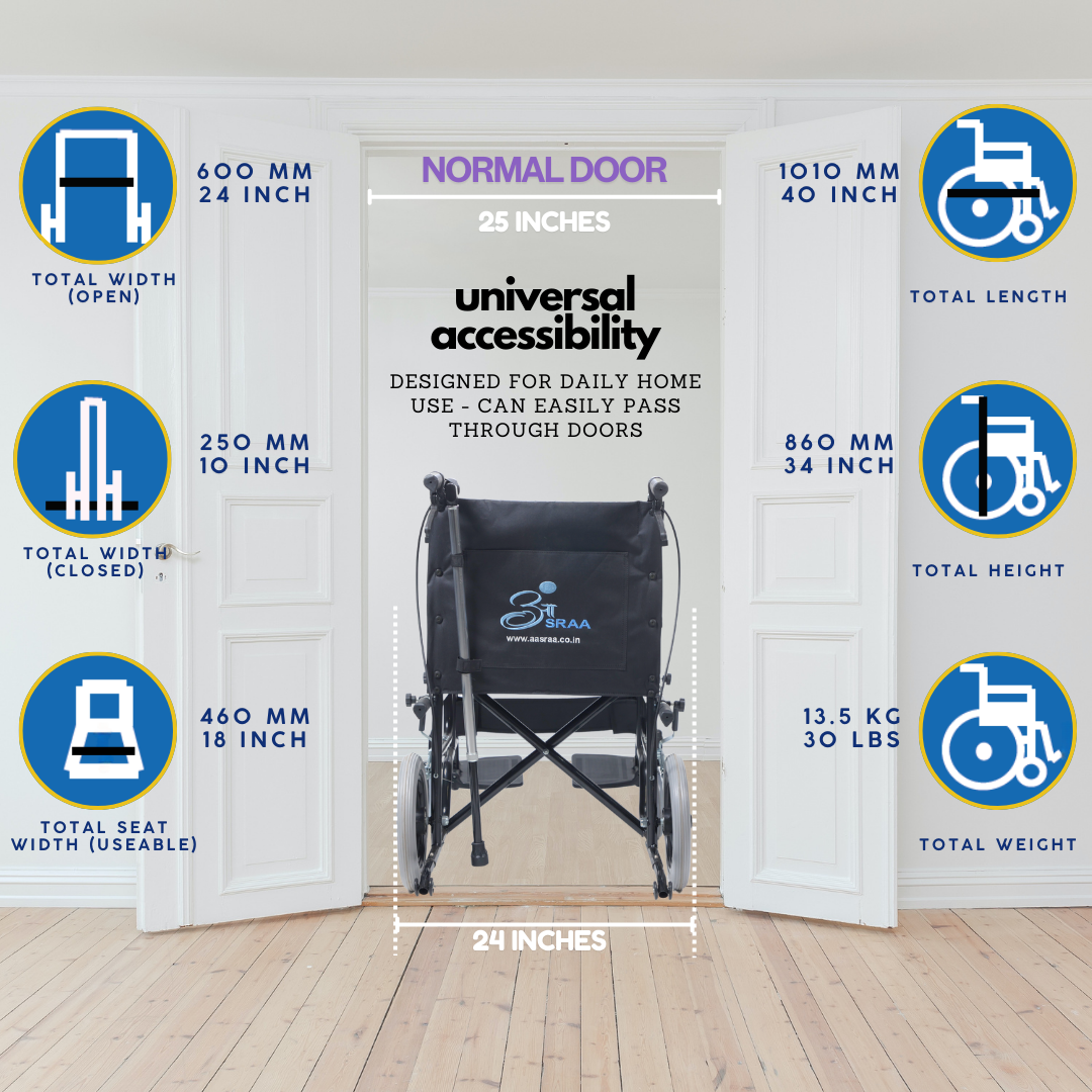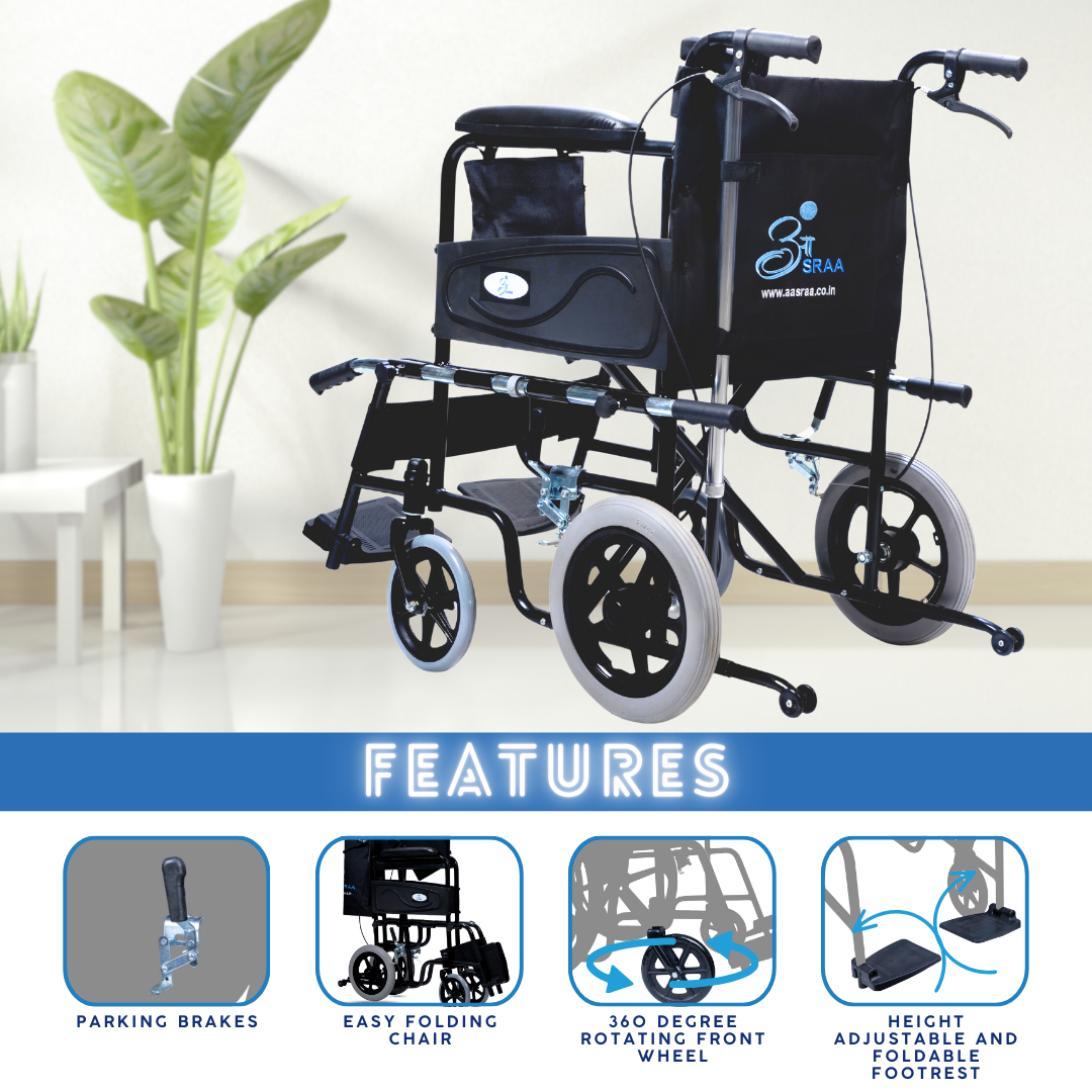 A feature-rich wheelchair designed for users with caretaker support. It combines safety and comfort with anti-tip wheels, seat-belt, attendant brakes, and additional nylon cushion with screw-hidden seats. Unique addons like lifting rods for stairs, loops with a free walking stick, storage pouch, and water-proof leatherite upholstery make it practical for daily use, while foldability and strong tyres ensure smooth mobility anywhere.