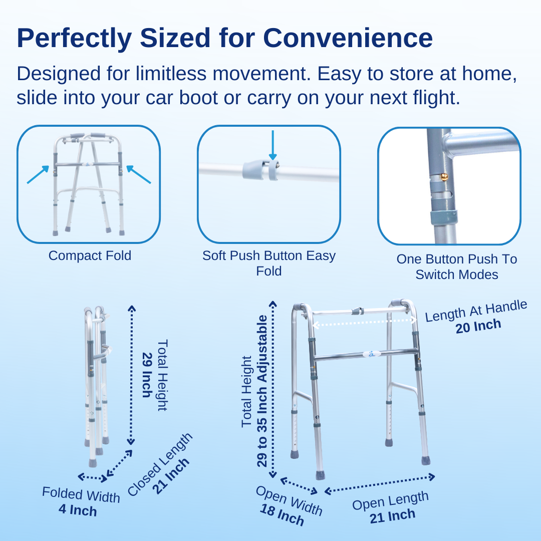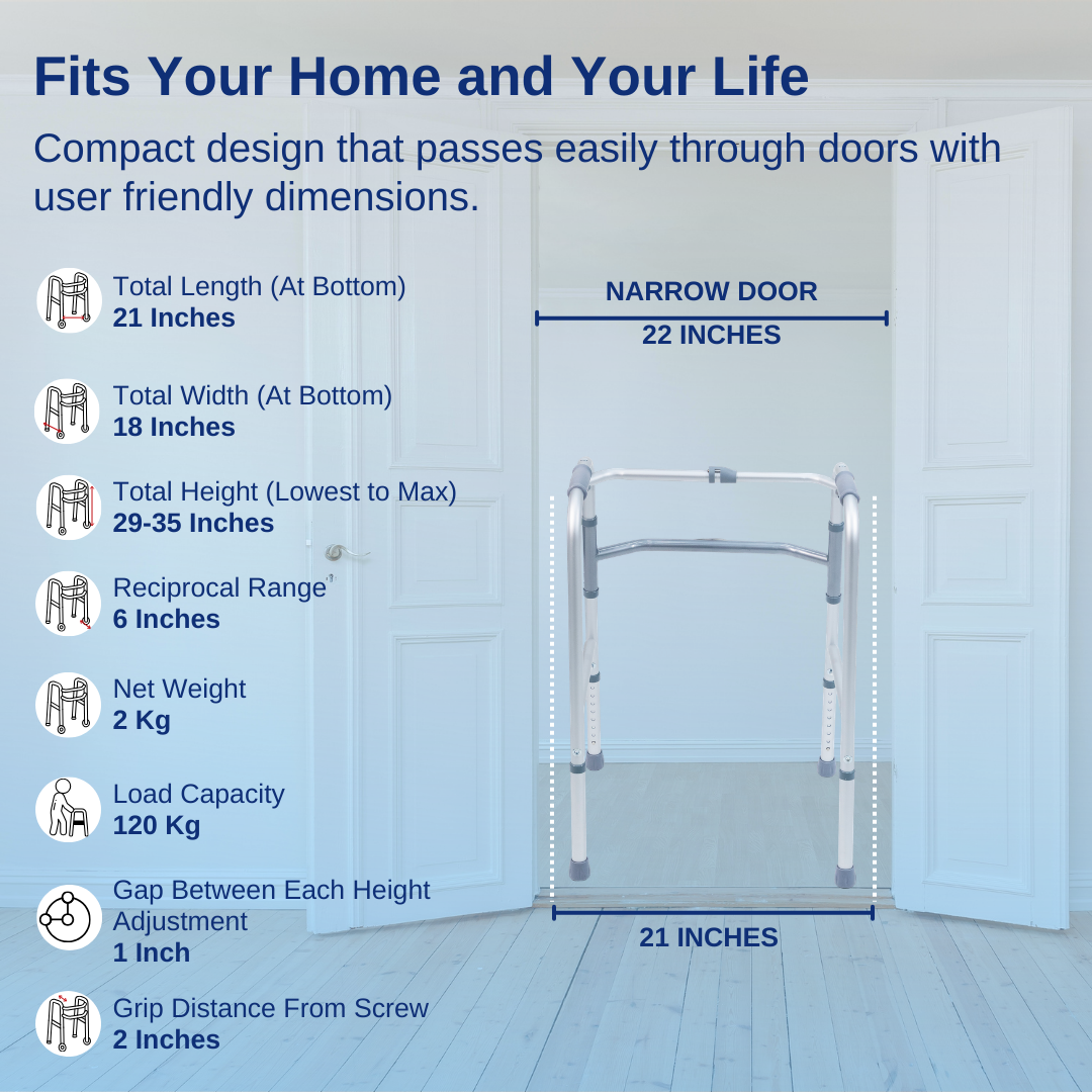 Engineered to support users safely and confidently, the walker offers a strong load capacity of up to 120 kg. Its reinforced tubing and precision-fit joints distribute weight evenly, giving users a secure and stable walking experience.