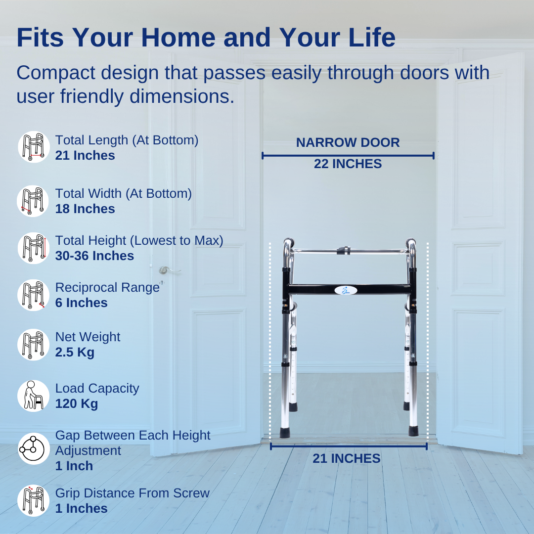 Versatile, comfortable, and built for support, a smart 4-in-1 solution for your mobility needs. Made from strong yet lightweight aluminum with a polished chrome finish, this walker is easy to carry, fold, and store with a simple center push-button mechanism.